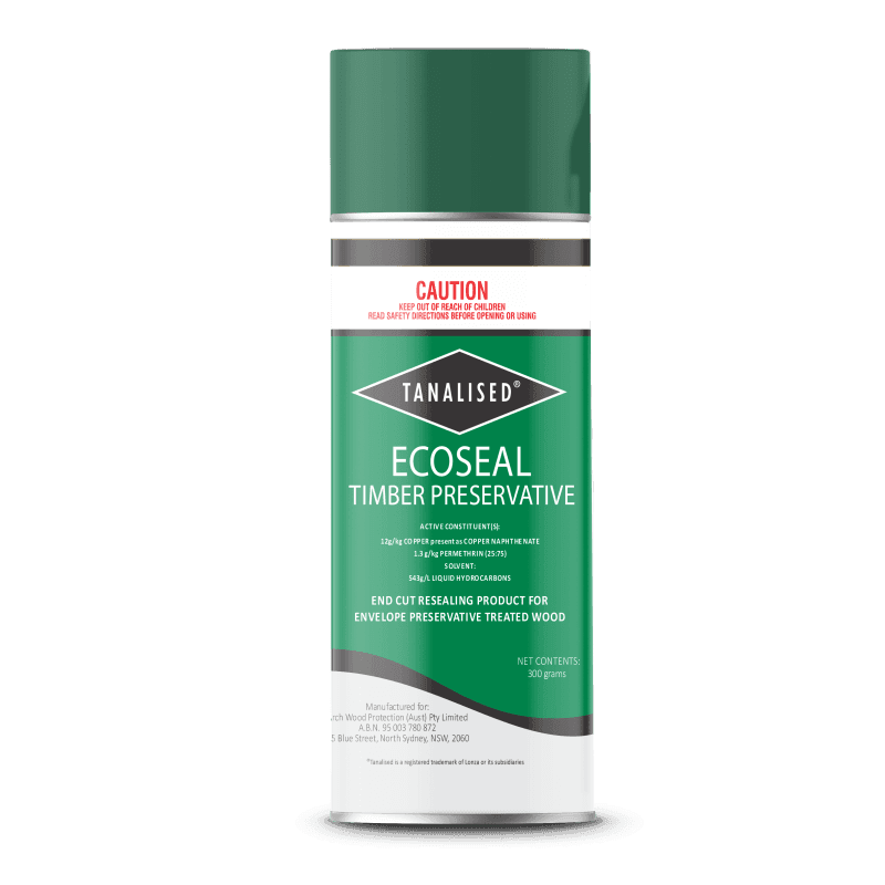 Ecoseal is a copper based, green coloured resealing solution for treated wood products intended for general outdoor applications such as landscaping, retaining walls, decking and fencing where cutting to length, notching, drilling, machining or other work may expose areas of un-penetrated wood. Ecoseal is only for supplementary application to timber that has been treated in accordance with AS1604.