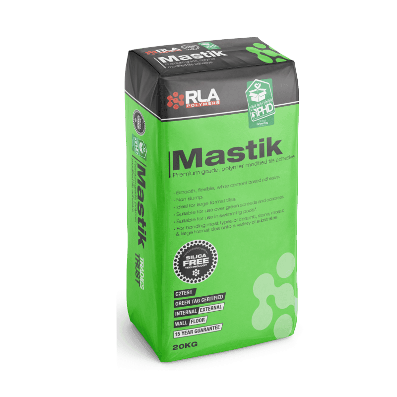 RLA Mastik is an economical, flexible polymer modified adhesive with great mastic properties for bonding most types of ceramic and porcelain tiles (with the exception of moisture sensitive stone and marbles) over concrete, cement render, rendered brickwork, blockwork, gyprock, plasterboard, fibre cement sheeting & RLA approved waterproofing membranes.