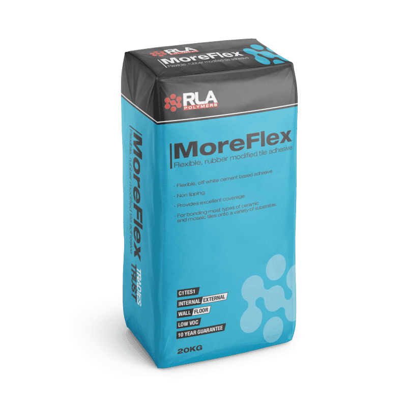 Moreflex is an economical, rubber filled, flexible polymer modified adhesive with great non slump properties for bonding most types of ceramics and porcelain tiles (with the exception of moisture sensitive stone and marbles) over concrete, cement render, rendered brickwork, blockwork, gyprock, plasterboard, fibre cement sheeting & RLA approved waterproofing membranes.